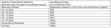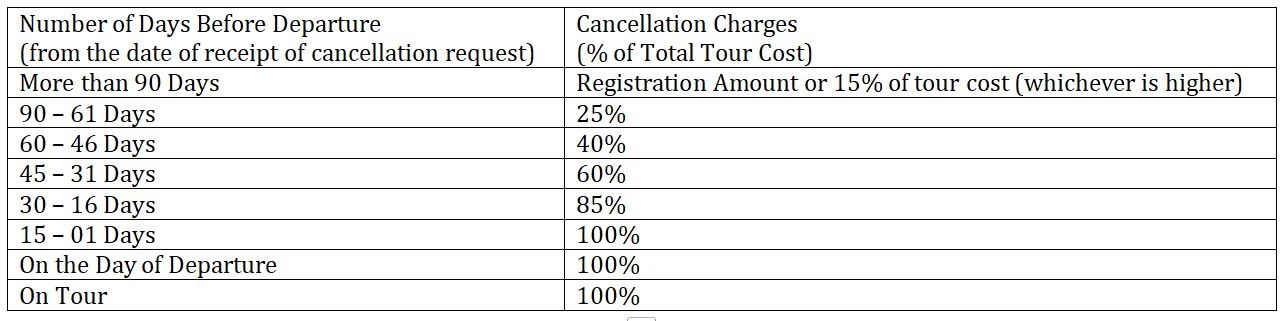 Cancellation charges are calculated as a percentage of the total tour cost and vary based on the number of days prior to the departure date when the cancellation request is received.