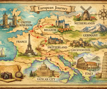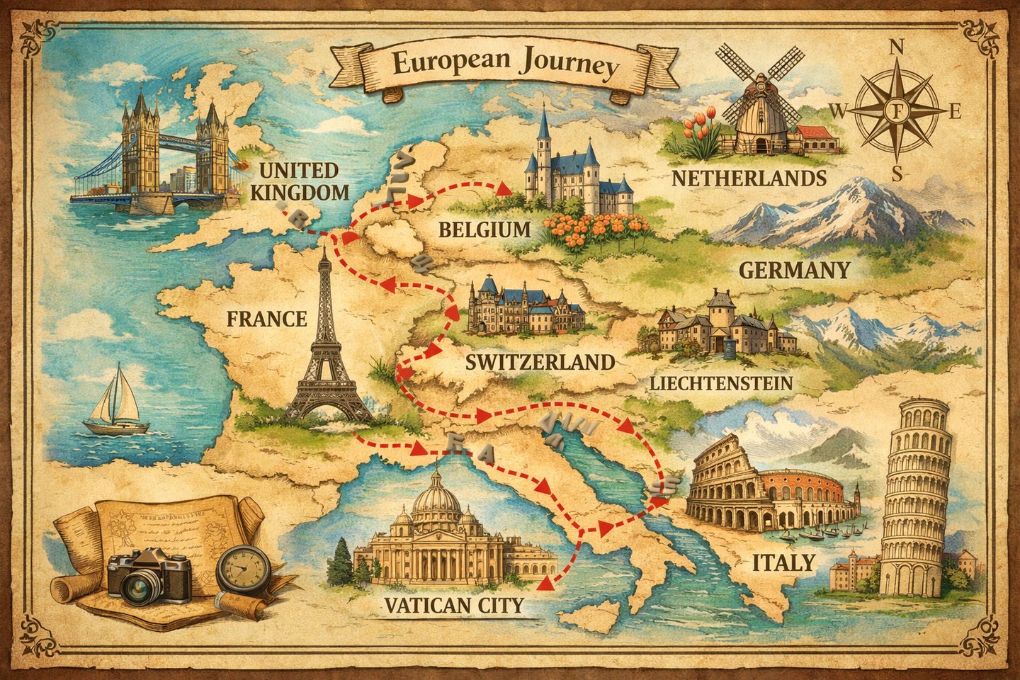 Experience the grandeur of 10 countries and 13 iconic cities in one unforgettable journey. United Kingdom |France | Belgium | Netherlands | Germany | Switzerland |Liechtenstein |Austria | Italy | Vatican City