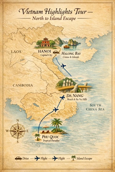 Discover the perfect blend of culture, scenic beauty, and island relaxation—explore Vietnam’s historic cities, stunning bays, and hill attractions, then unwind on the pristine beaches of Phu Quoc Island.A journey filled with heritage, nature, and tropical serenity in one unforgettable experience. ✨